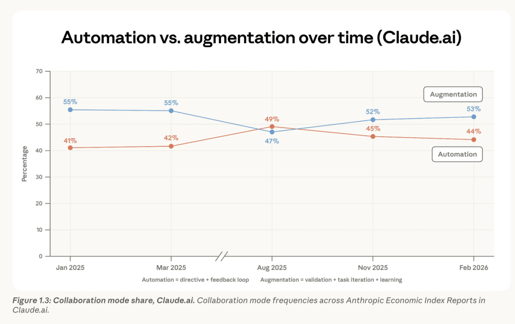 2. People are using Claude a bit more for augmentation of their and a little less from complete automation